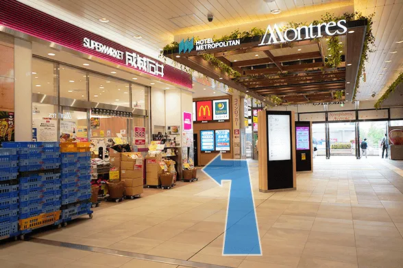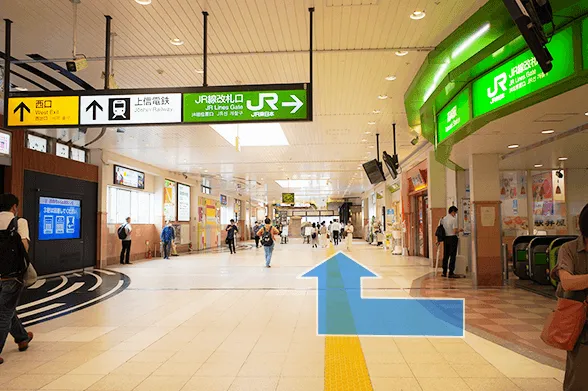 ①JR「高崎駅」改札を出て、西口方面へ向かいます。